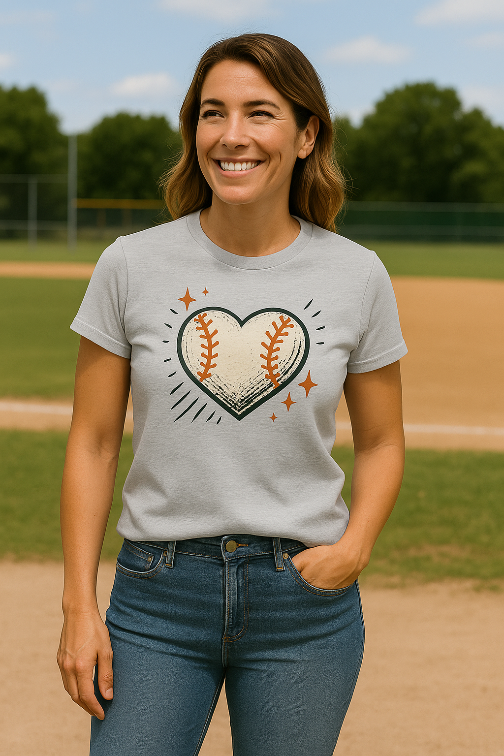 Heart-shaped baseball design with retro-style stitching and accent sparkles