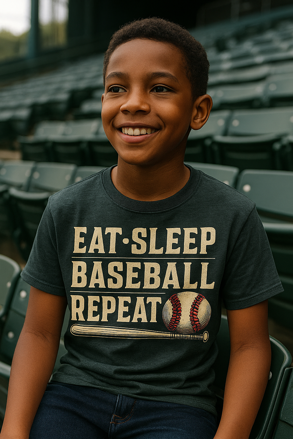 The Eat Sleep Baseball Repeat tee is made for kids who live and breathe the game. With bold varsity lettering, a classic baseball-bat graphic, and an always-on energy, this shirt is perfect for practice days, game nights, and everywhere in between.