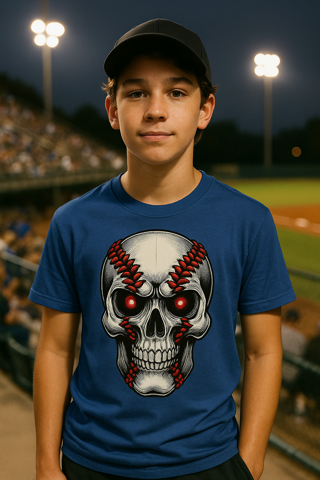 The Baseball Skull tee is for teen athletes who play with a killer instinct. Featuring a fierce skull with baseball stitching carved into its design and glowing red eyes, this shirt is part intimidation, part obsession. It’s not just a sport — it’s your identity.